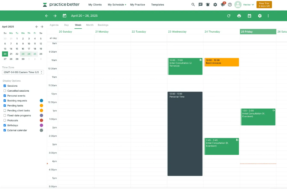The scheduling system in Practice Better is one of the better ones I’ve had the chance to work with. It’s drag-and-drop, highly customizable, and doesn’t make you feel like you’re juggling spreadsheets just to get through your day. You can set up multiple calendar views, create different appointment types, block time, and manage both individual and group sessions without it turning into a mess.